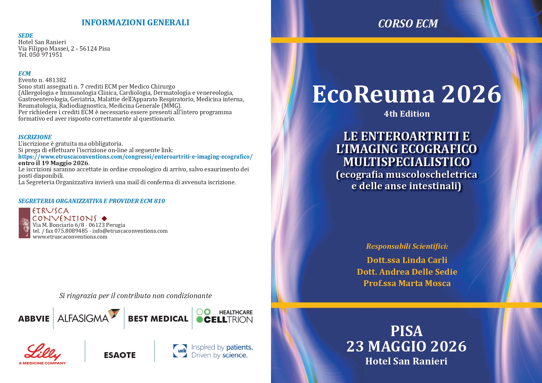 EcoReuma 2026 – LE ENTEROARTRITI E L’IMAGING ECOGRAFICO MULTISPECIALISTICO SCARICA DEPLIANT SCHEDA ISCRIZIONE on line Nome(Obbligatorio) Cognome(Obbligatorio) Città(Obbligatorio) Telefono(Obbligatorio) Luogo di nascita(Obbligatorio) Data di nascita(Obbligatorio) Email(Obbligatorio) Crediti ECM(Obbligatorio) Desidero crediti ECM NON desidero i crediti ECM Per Medico Chirurgo: Allergologia e Immunologia Clinica Cardiologia Dermatologia e venereologia Gastroenterologia Geriatria Malattie dell’Apparato Respiratorio Medicina interna Reumatologia Radiodiagnostica Medicina Generale (MMG) Privacy(Obbligatorio)Il GDPR (Regolamento Generale sulla Protezione dei Dati) UE 2016/679, in vigore dal 25/05/2018 tutela la tua privacy ed è costituito da una serie di norme che disciplina la privacy e la sicurezza dei dati personali e sostituisce la direttiva sulla protezione dei dati. AUTORIZZAZIONE ALLA GESTIONE DEI DATI AL FINE DI COMPLETARE L’ISCRIZIONE AD UN EVENTO ORGANIZZATO DA ETRUSCA CONVENTIONS AUTORIZZO ETRUSCA CONVENTIONS A GESTIRE I MIEI DATI PERSONALI AL FINE DI COMPLETARE LA MIA ISCRIZIONE E LE FUTURE POSSIBILI ISCRIZIONI. ETRUSCA CONVENTIONS DICHIARA CHE QUESTI DATI NON SARANNO DIFFUSI A NESSUNO CHE NON SIA STRETTAMENTE COLLEGATO ALLA GESTIONE DELL’ISCRIZIONE. IMPORTANTE: se la presente autorizzazione viene negata, non sarà possibile procedere con l'iscrizione all'evento. AUTORIZZO ETRUSCA CONVENTIONS A GESTIRE I MIEI DATI PERSONALI AL FINE DI COMPLETARE LA MIA ISCRIZIONE E LE FUTURE POSSIBILI ISCRIZIONI. ETRUSCA CONVENTIONS DICHIARA CHE QUESTI DATI NON SARANNO DIFFUSI A NESSUNO CHE NON SIA STRETTAMENTE COLLEGATO ALLA GESTIONE DELL’ISCRIZIONE. Leggi l'informativa completa.Newsletter(Obbligatorio)AUTORIZZAZIONE ALLA GESTIONE DEI DATI AL FINE DI RICEVERE COMUNICAZIONI INERENTI CONVEGNI SCIENTIFICI da etrusca conventions organizzati. Autorizzo Etrusca Conventions a gestire i miei dati personali per comunicazioni marketing (annunci, programmi e informazioni inerenti convegni ed eventi organizzati da Etrusca Conventions). Etrusca Conventions dichiara che questi dati non saranno diffusi a nessuno che non sia strettamente collegato alla gestione delle iscrizioni Non autorizzo ← →