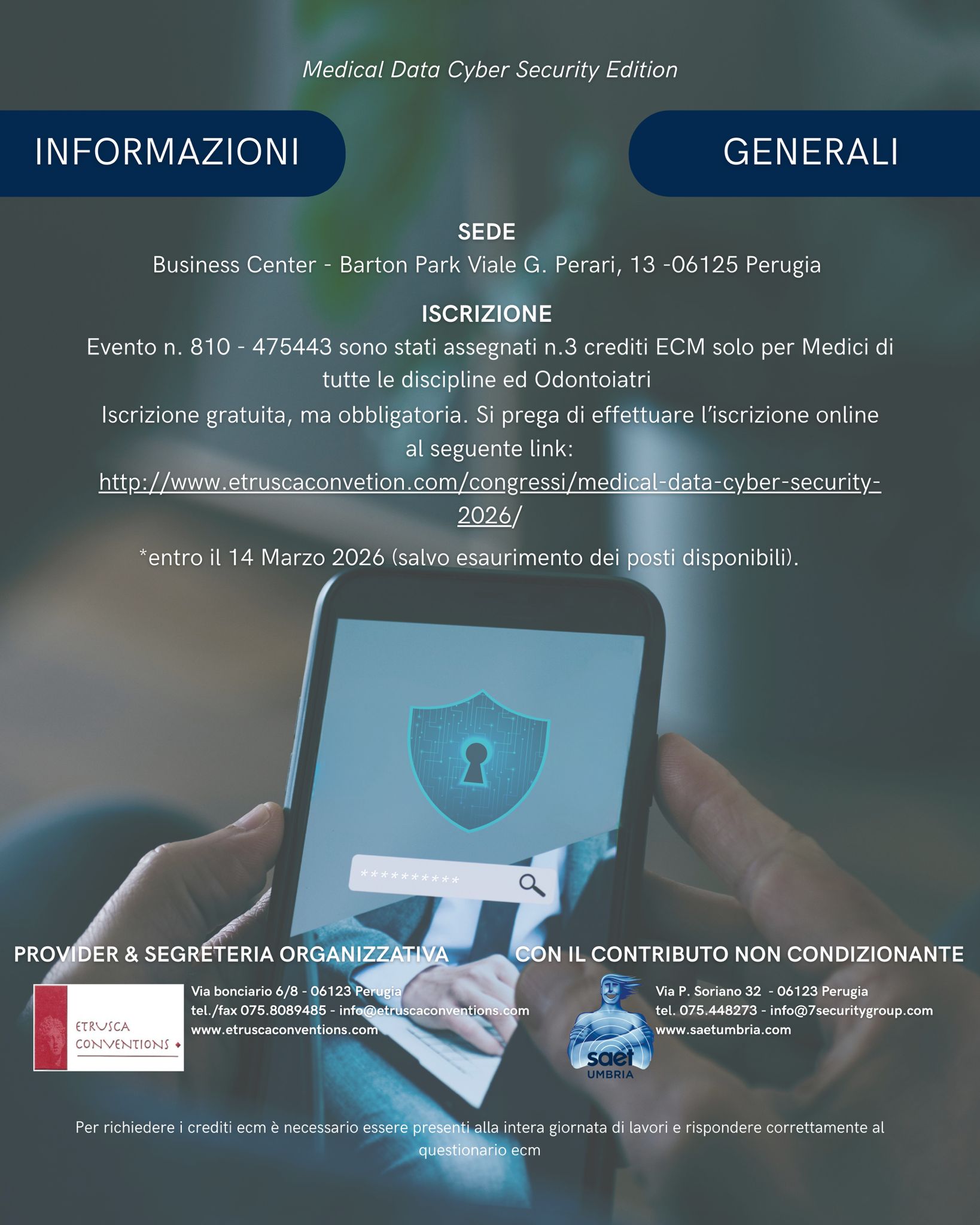 Medical Data Cyber Security 2026 SCARICA DEPLIANT SCHEDA ISCRIZIONE on line Nome(Obbligatorio) Cognome(Obbligatorio) Città(Obbligatorio) Telefono(Obbligatorio) Luogo di nascita(Obbligatorio) Data di nascita(Obbligatorio) Email(Obbligatorio) Crediti ECM(Obbligatorio) Desidero crediti ECM NON desidero i crediti ECM Per: Medico (tutte le discipline) Odontoiatra Privacy(Obbligatorio)Il GDPR (Regolamento Generale sulla Protezione dei Dati) UE 2016/679, in vigore dal 25/05/2018 tutela la tua privacy ed è costituito da una serie di norme che disciplina la privacy e la sicurezza dei dati personali e sostituisce la direttiva sulla protezione dei dati. AUTORIZZAZIONE ALLA GESTIONE DEI DATI AL FINE DI COMPLETARE L’ISCRIZIONE AD UN EVENTO ORGANIZZATO DA ETRUSCA CONVENTIONS AUTORIZZO ETRUSCA CONVENTIONS A GESTIRE I MIEI DATI PERSONALI AL FINE DI COMPLETARE LA MIA ISCRIZIONE E LE FUTURE POSSIBILI ISCRIZIONI. ETRUSCA CONVENTIONS DICHIARA CHE QUESTI DATI NON SARANNO DIFFUSI A NESSUNO CHE NON SIA STRETTAMENTE COLLEGATO ALLA GESTIONE DELL’ISCRIZIONE. IMPORTANTE: se la presente autorizzazione viene negata, non sarà possibile procedere con l'iscrizione all'evento. AUTORIZZO ETRUSCA CONVENTIONS A GESTIRE I MIEI DATI PERSONALI AL FINE DI COMPLETARE LA MIA ISCRIZIONE E LE FUTURE POSSIBILI ISCRIZIONI. ETRUSCA CONVENTIONS DICHIARA CHE QUESTI DATI NON SARANNO DIFFUSI A NESSUNO CHE NON SIA STRETTAMENTE COLLEGATO ALLA GESTIONE DELL’ISCRIZIONE. Leggi l'informativa completa.Newsletter(Obbligatorio)AUTORIZZAZIONE ALLA GESTIONE DEI DATI AL FINE DI RICEVERE COMUNICAZIONI INERENTI CONVEGNI SCIENTIFICI da etrusca conventions organizzati. Autorizzo Etrusca Conventions a gestire i miei dati personali per comunicazioni marketing (annunci, programmi e informazioni inerenti convegni ed eventi organizzati da Etrusca Conventions). Etrusca Conventions dichiara che questi dati non saranno diffusi a nessuno che non sia strettamente collegato alla gestione delle iscrizioni Non autorizzo ← →